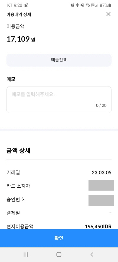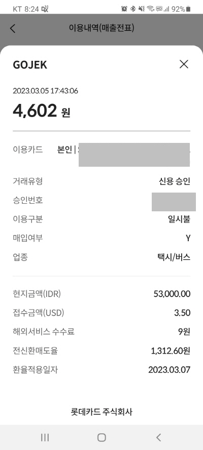 사용한 금액은 196,450 IDR 이고, 수수료 전부 포함해서 저에게 17,109원이 청구되었습니다.