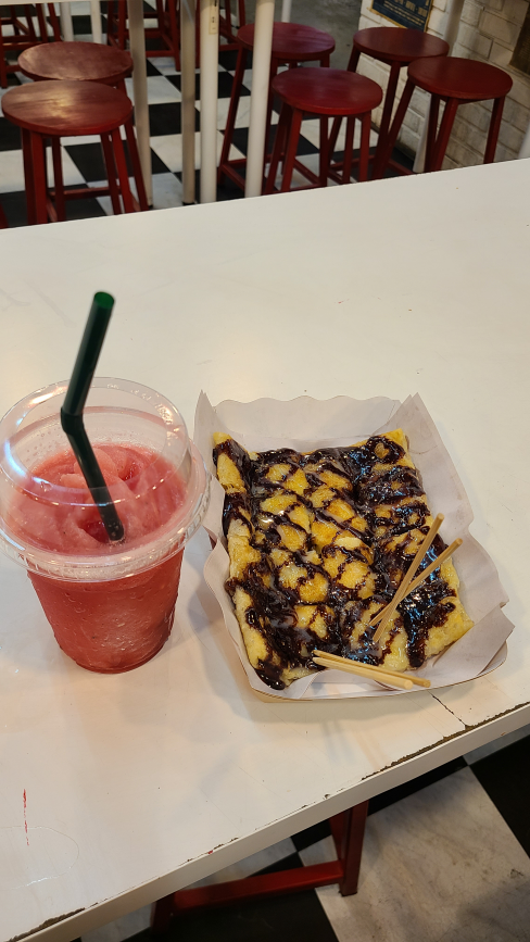 로띠 파는 곳들도 많았어요. 땡모반(수박주스)는 따로 샀구요. 수박주스는 40바트 (약 1500원). 로띠는 구성품에 따라 가격이 달라지는데, 저는 70바트 (약 2,600원) 짜리 였습니다.