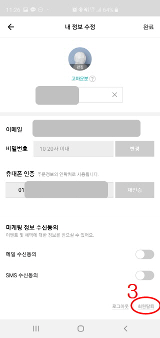 Step 3. 또 화면이 바뀌면서 "내 정보 수정" 화면으로 바뀌는데요, 아래쪽에 "회원 탈퇴" 버튼이 있습니다.