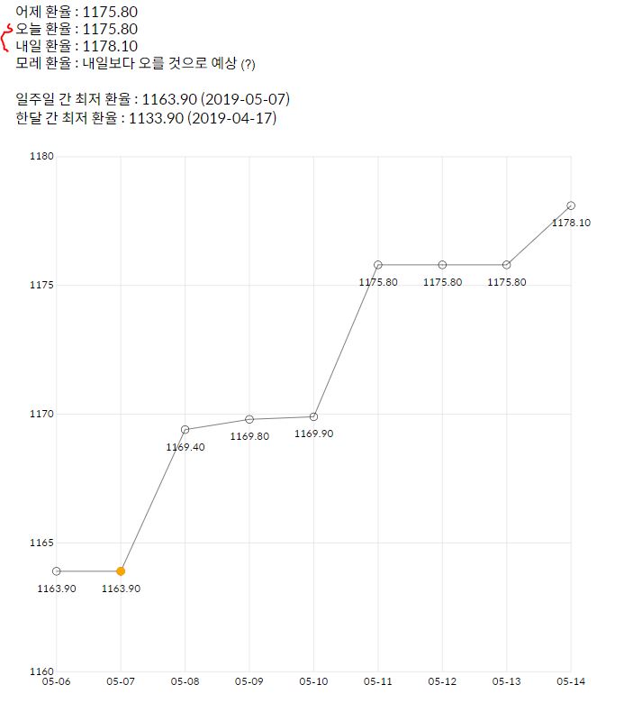 그러면 이렇게 오늘과 내일의 환율을 알 수 있어서, 적어도 내일 사는 것 보다는 오늘 사는게 낫다는 정도는 알 수 있습니다.