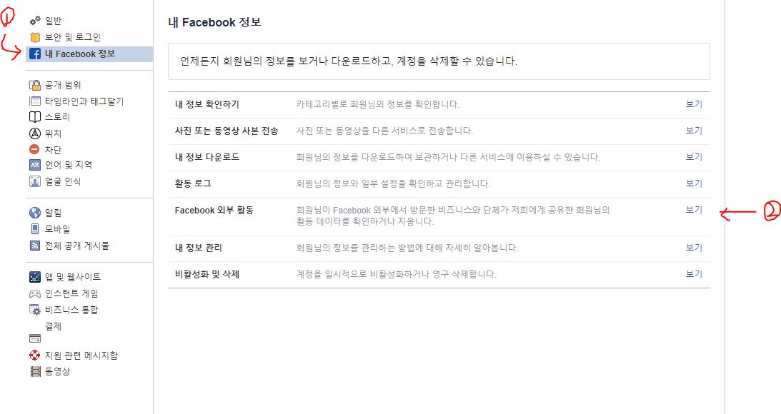 그 다음으로 좌측에서 "내 Facebook 정보" 를 클릭하고 우측에서 "Facebook 외부 활동"을 클릭합니다.