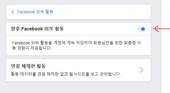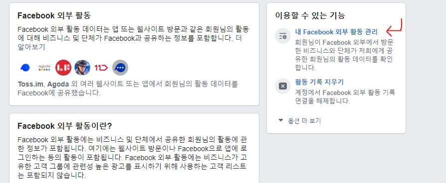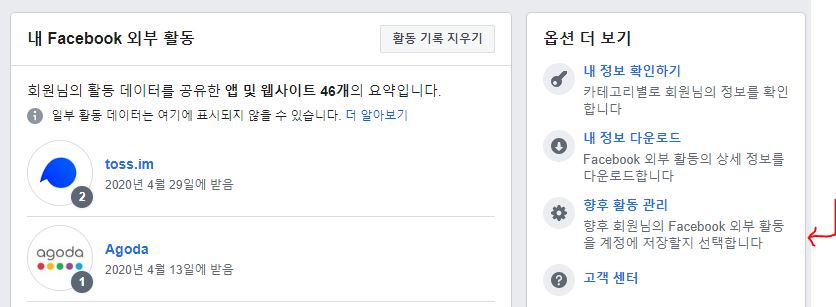 바뀐 화면 우측에서 "내 Facebook 외부 활동 관리" 를 클릭합니다.