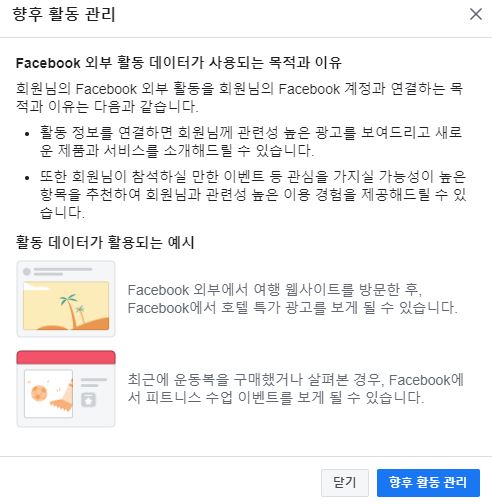 Facebook이 외부 활동 데이터를 사용하는 이유와 목적등이 나오는 팝업이 나옵니다. 계속해서 "향후 활동 관리"로 갑니다.