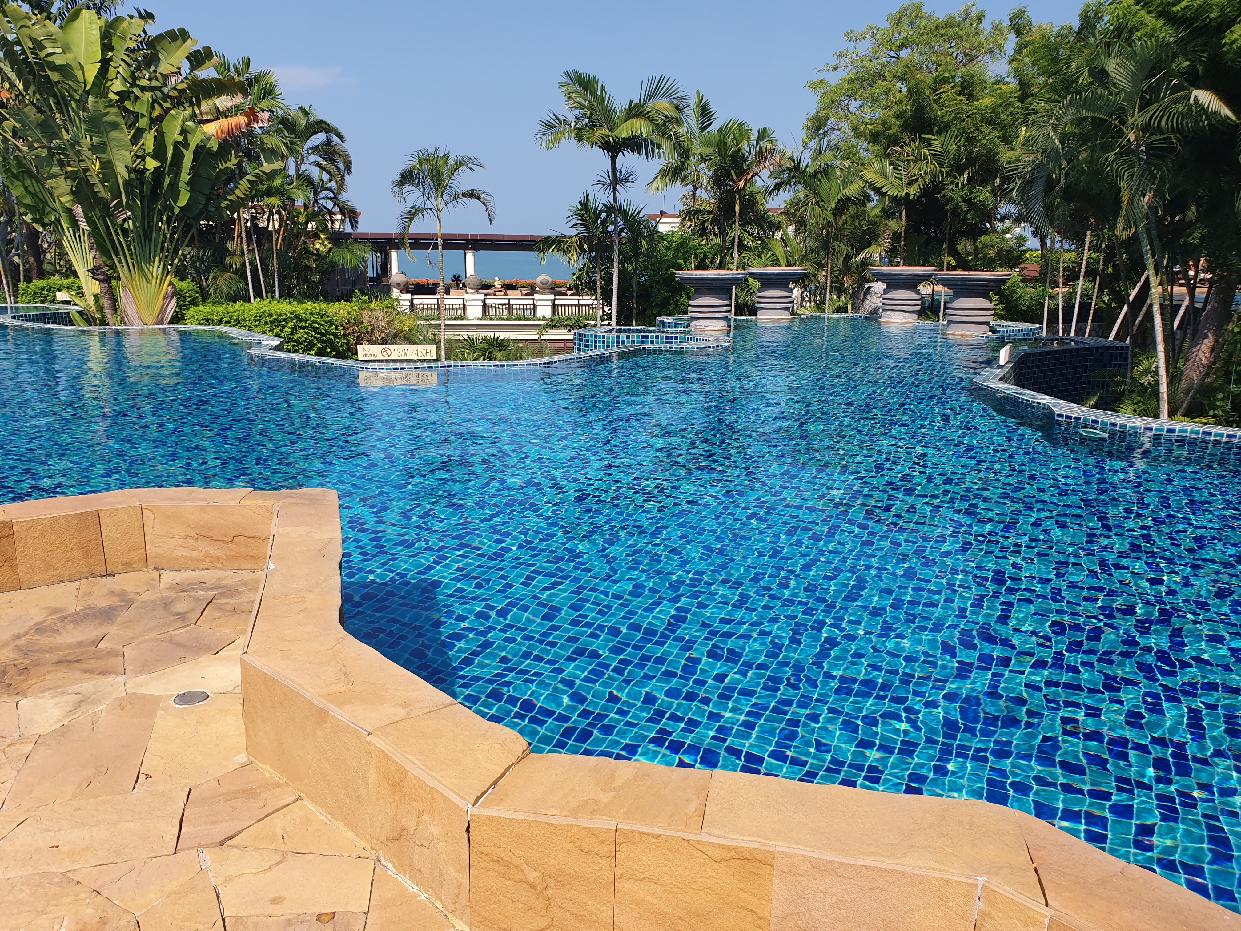 인터컨티넨탈 파타야는 L1, L2, L3의 3개의 풀을 가지고 있습니다. L1은 유아풀이 있구요. L2가 제일 큰 것 같더라구요. 아래 사진은 L2 이며, 저 멀리 태국만 까지도 보이네요.