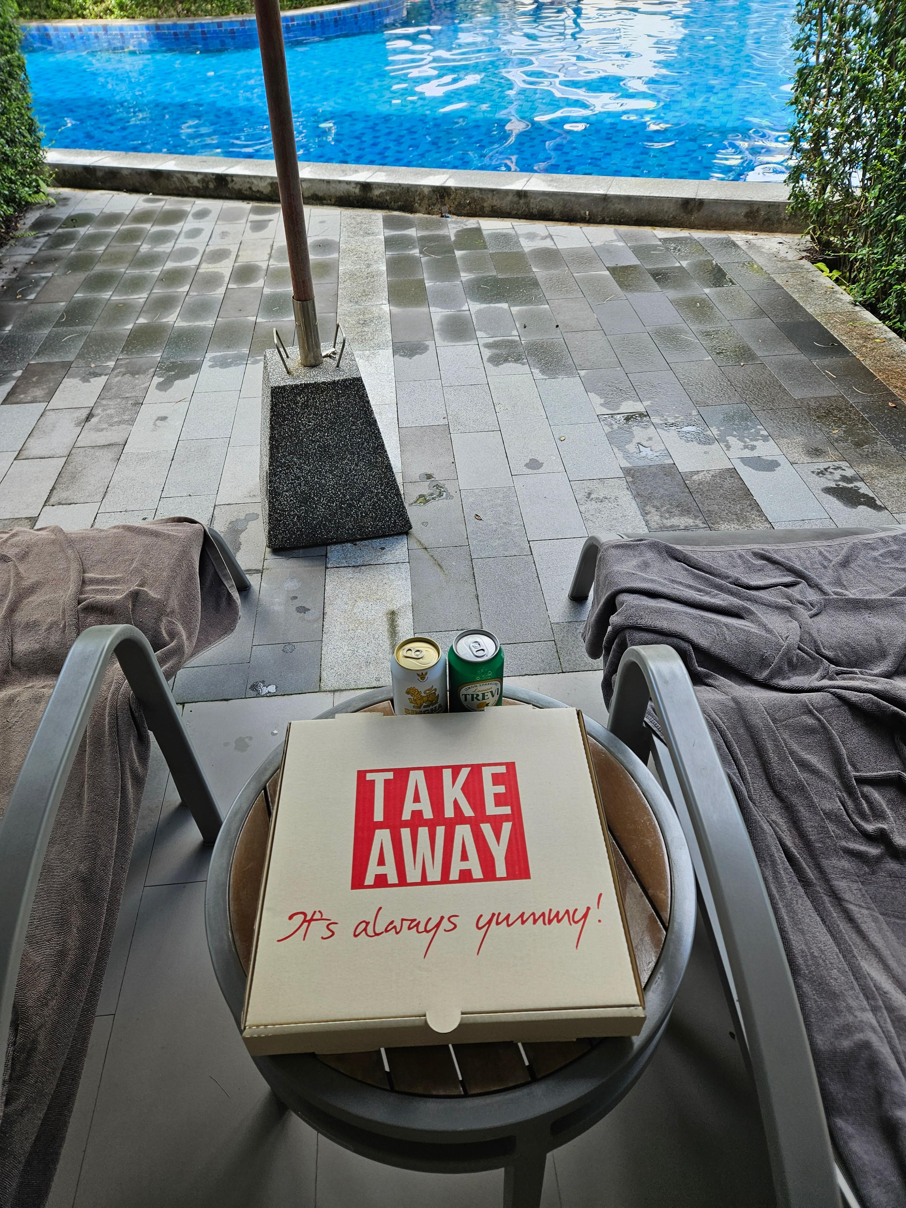 또한 숙소 내의 스파나 식당(레스토랑) 들이 상당히 합리적인 가격입니다. 제가 음식을 가져 오면(테이크 어웨이, take away) 추가 할인을 해주기도 합니다. 그리하여 낮에는 마트에서 산 맥주와 테이크 어웨이 한 피자로 저렴하게 먹을 수 있습니다. (저는 방에서 바로 수영장 접근 가능한 풀액세스룸 (Pool Access Room) 이었습니다.