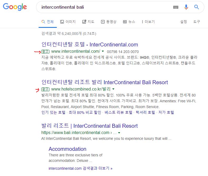 이 중에서 가능하면 "광고" 인 것은 빼시고, 그리고 가능하면 가장 구체적인 호텔을 지칭하는 페이지를 찾으시면 됩니다. 저는 광고 빼고 나니 3번째에 있는 것이네요. 그리고 첫번째 처럼 그냥 "인터컨티넨탈" 이 아니라 "InterContinental Bali Resort"라고 되어 있네요