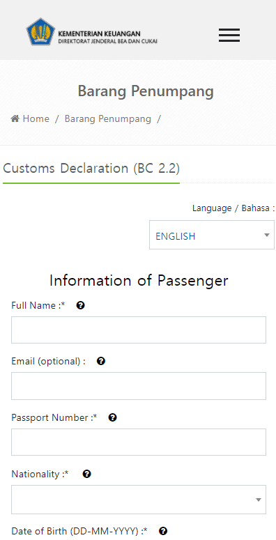 BACK TO EHAC Customs Declaration (BC 2.2) e-Customs Declaration (BC 2.2) Language / Bahasa : IndonesiaEnglish