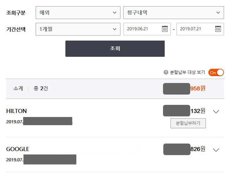 힐튼이 6월에 1건, 7월에 1건이 있네요. 예상하신대로 6월건은 Deposit 이고, 7월건이 실제 호텔 이용요금입니다.
